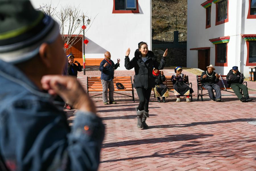 Gexi Wangmu greets seniors at an elderly care center in Maerkang City, Aba Tibetan-Qiang Autonomous Prefecture, southwest China's Sichuan Province, Feb. 18, 2025. (Xinhua/Wang Xi)