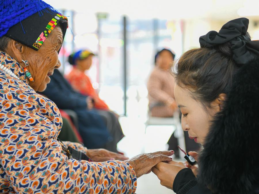 Gexi Wangmu (R) applies nail polish for a senior at an elderly care center in Maerkang City, Aba Tibetan-Qiang Autonomous Prefecture, southwest China's Sichuan Province, Feb. 19, 2025. (Xinhua/Wang Xi)