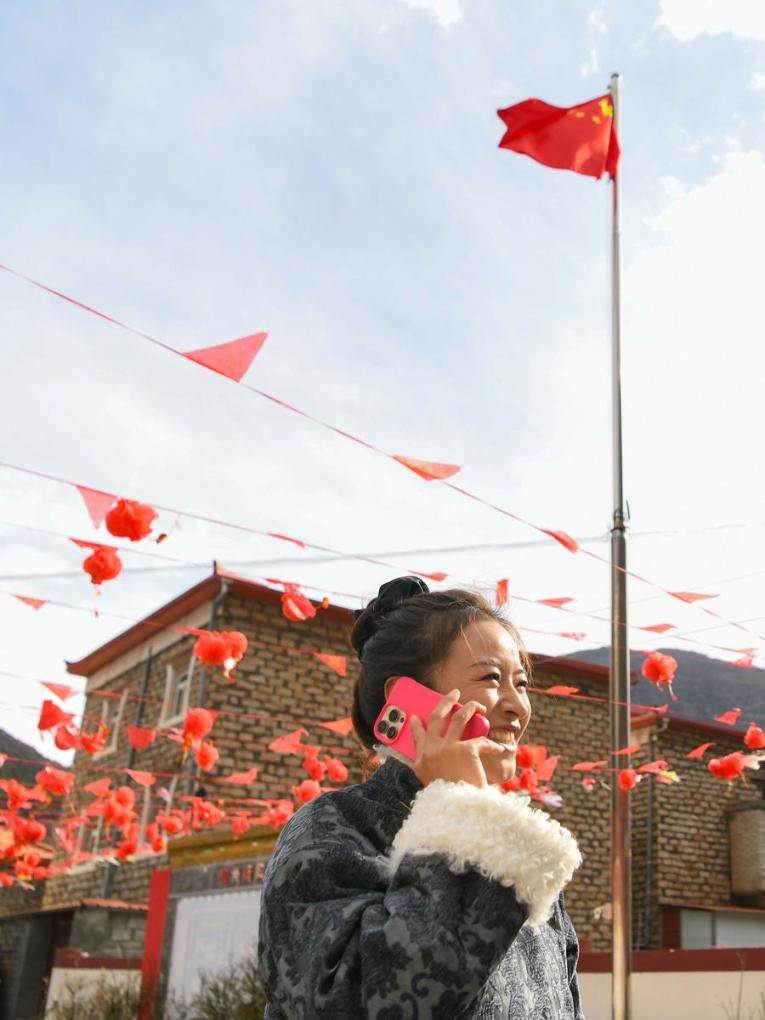 Gexi Wangmu contacts an elderly villager's child who works away from home for related information in Songgang Village of Maerkang City, Aba Tibetan-Qiang Autonomous Prefecture, southwest China's Sichuan Province, Feb. 18, 2025. (Xinhua/Wang Xi)