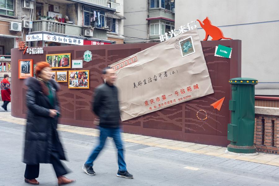 People walk past an art installation of "Mailbox No. 1" at Minzhu Village Community in Xiejiawan Sub-district of Jiulongpo District, southwest China's Chongqing Municipality, Feb. 25, 2025. (Xinhua/Huang Wei)