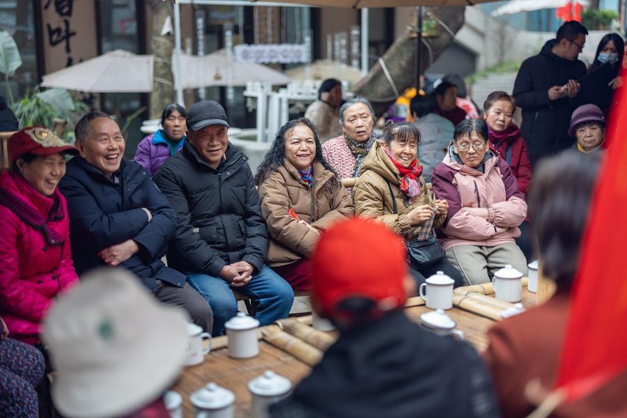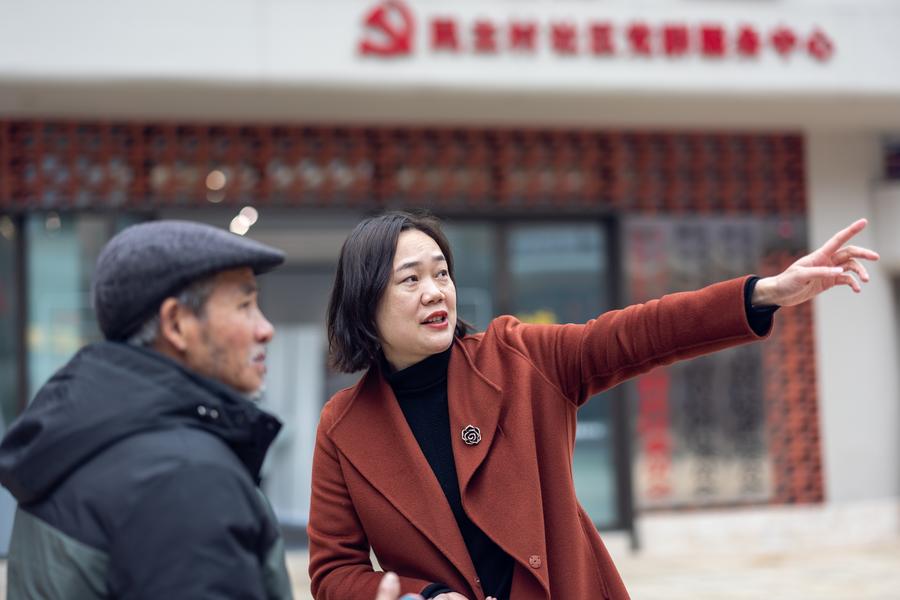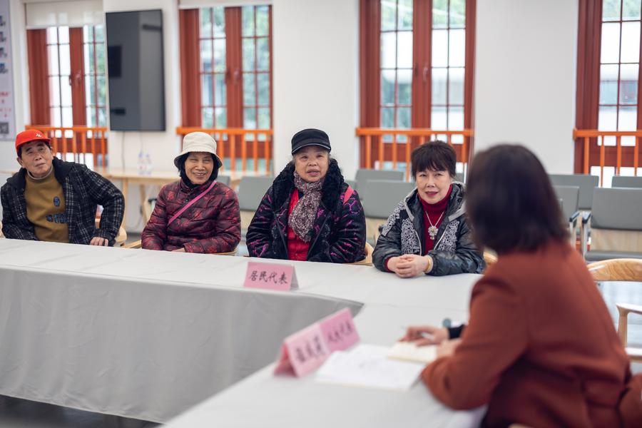 Wu Chengli solicits suggestions from local residents at Minzhu Village Community in Xiejiawan Sub-district of Jiulongpo District, southwest China's Chongqing Municipality, Feb. 25, 2025. (Xinhua/Huang Wei)