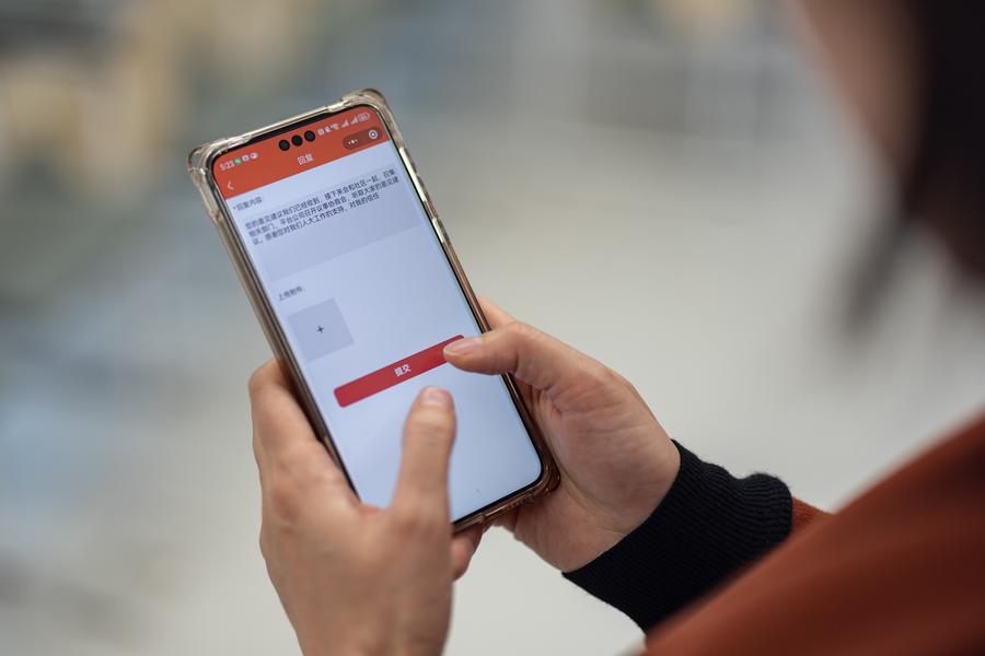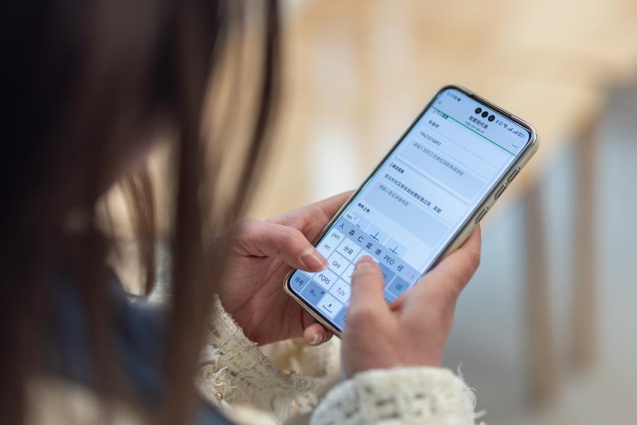 A resident sends suggestions via her mobile phone at Minzhu Village Community in Xiejiawan Sub-district of Jiulongpo District, southwest China's Chongqing Municipality, Feb. 25, 2025. (Xinhua/Huang Wei)