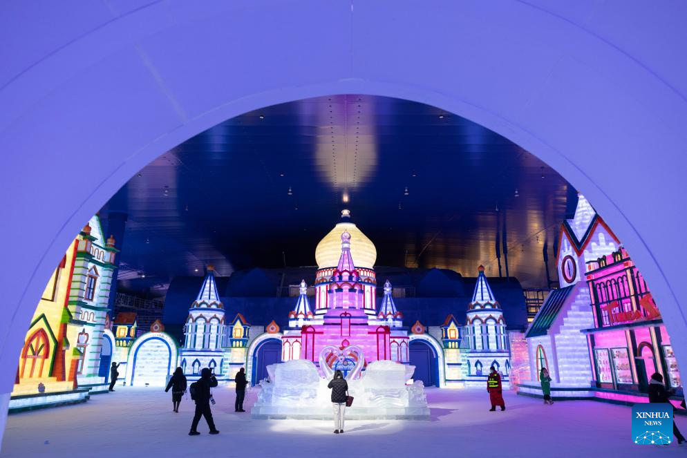 Tourists appreciate the ice-and-snow sculptures at an indoor ice-and-snow theme park within Harbin Ice-Snow World in Harbin, northeast China's Heilongjiang Province, Feb. 27, 2025. The world's largest indoor ice-and-snow theme park, a facility located within Harbin Ice-Snow World, reopened on Thursday morning as the outdoor Harbin Ice-Snow World officially closed its 26th edition on Wednesday. Covering an area of 23,000 square meters, the indoor ice-and-snow attraction has seen a comprehensive refurbishment. Initially launched in July 2024, the facility features advanced audio-visual interactivity, vibrant ice sculptures, and elements from past editions of the park and the 2025 Asian Winter Games. (Xinhua/Xie Jianfei)