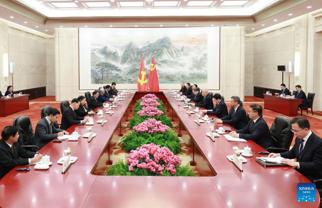 Cai Qi, a member of the Standing Committee of the Political Bureau of the Communist Party of China (CPC) Central Committee and a member of the Secretariat of the CPC Central Committee, meets with a delegation led by Bounthong Chitmany, a politburo member of the Lao People's Revolutionary Party (LPRP) Central Committee, a permanent member of the Secretariat of the LPRP Central Committee, and vice president of Laos, in Beijing, capital of China, Feb. 27, 2025. (Xinhua/Wang Ye)