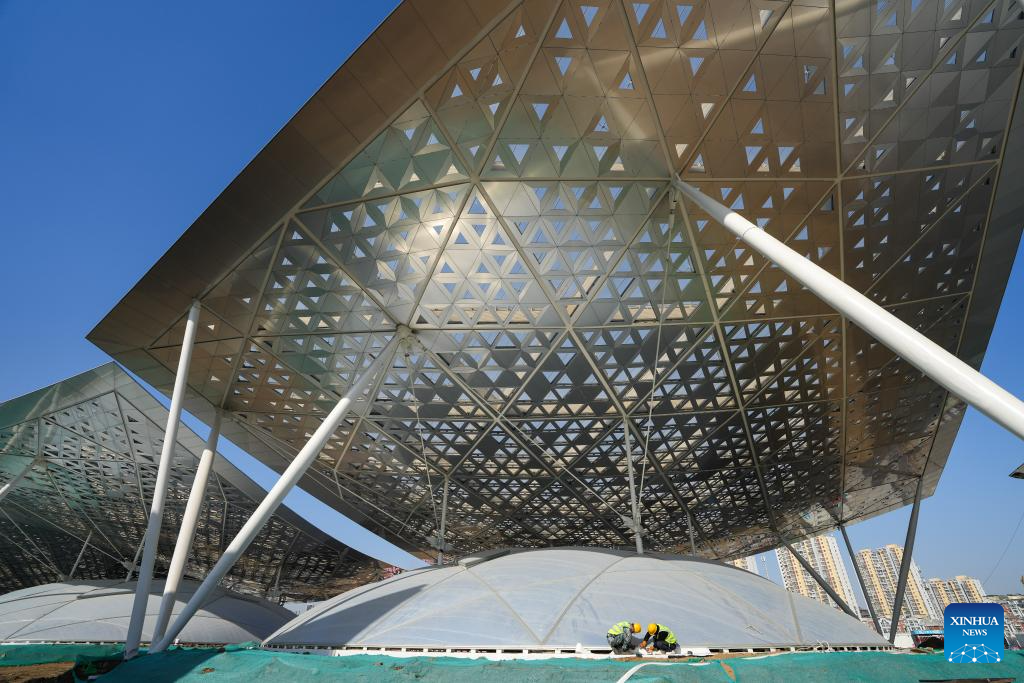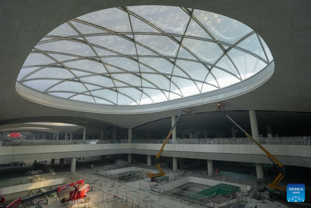 Workers are pictured at the construction site of the Beijing sub-center comprehensive transportation hub in Tongzhou District, sub-center of Beijing, capital of China, Feb. 26, 2025. The construction of the Beijing sub-center comprehensive transportation hub, Asia's largest underground transportation complex, is proceeding smoothly. The hub will link cross-regional and intercity railways, and several metro lines when completed as scheduled by the end of 2025. (Xinhua/Ju Huanzong)