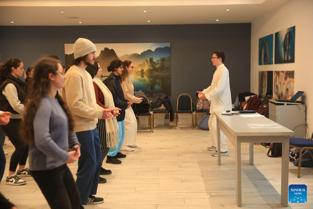 Yang Xiaowei (R), doctor from the Center for Traditional Chinese Medicine at the University of Malta, guides people to practice Baduanjin, a traditional form of Chinese aerobic exercise, in Msida, Malta, on Feb. 26, 2025. (Xinhua/Chen Wenxian)