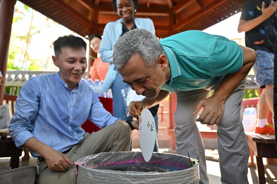 Foreigners learn to make traditional Chinese lacquered fans in Haikou, south China's Hainan Province, July 6, 2024. (Xinhua/Guo Cheng)