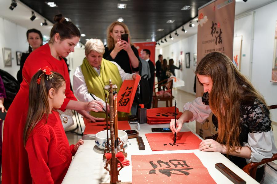 Visitors experience Chinese calligraphy at the China Cultural Center in Moscow, Russia, Jan. 25, 2025. (Xinhua/Cao Yang)