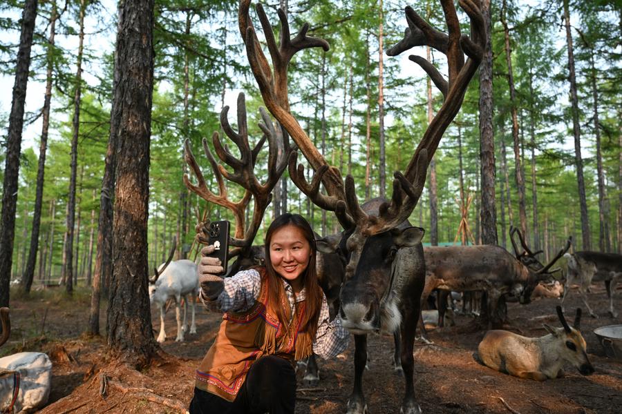 Ayousha records short videos at the reindeer herding site in Jinhe Town of Genhe City, north China's Inner Mongolia Autonomous Region, July 3, 2024. (Xinhua/Wang Xuebing)