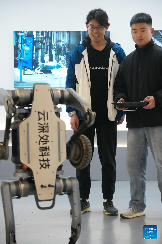 Yang Jun tests a quadruped robot in Hangzhou, east China's Zhejiang Province, Feb. 28, 2025. Yang Jun, born in 2003, is an engineer on the technical support team at Hangzhou-based robotics firm DEEP Robotics. An enthusiast of anime and mech models, he majored in computer science and technology in college and logged in his dreamed walk of life after graduation.