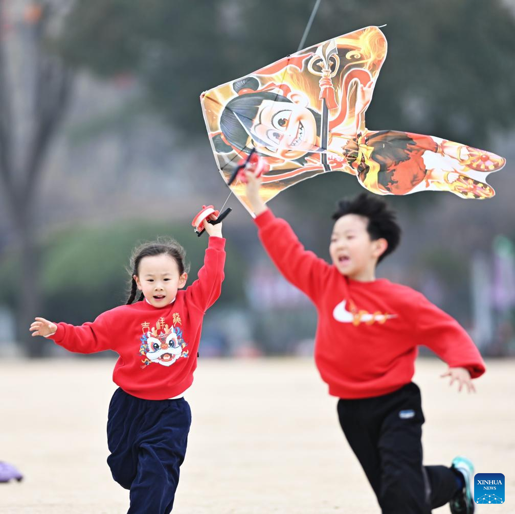 Children fly kites at a park in Tengzhou City, east China's Shandong Province, March 1, 2025. (Photo by Li Zhijun/Xinhua)