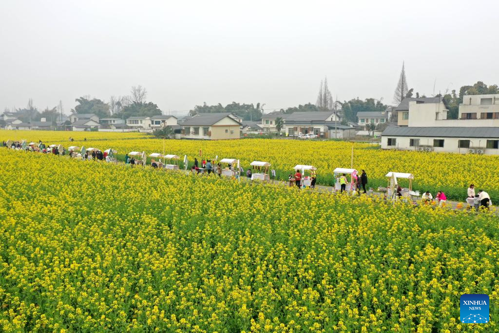 This drone photo shows people shopping at a market set up among fields of rape flowers at Xinguang Village in Meishan City, southwest China's Sichuan Province, March 1, 2025. (Photo by Yao Yongliang/Xinhua)
