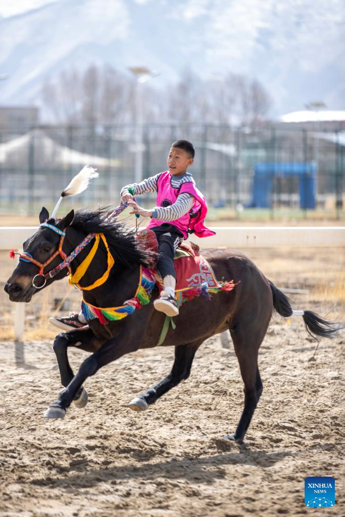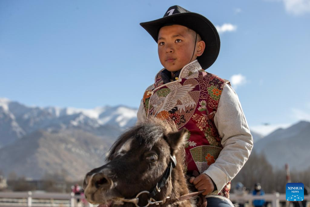 A young contestant competes during a horse race in Lhasa, southwest China's Xizang Autonomous Region, March 2, 2025. The city of Lhasa hosted an equestrian show on the third day of the Tibetan New Year, featuring traditional equestrian performances and horse races. The riders were dressed in colorful Tibetan clothes and galloped gracefully around the racecourse in the northern suburbs of the city. (Xinhua/Jiang Fan)