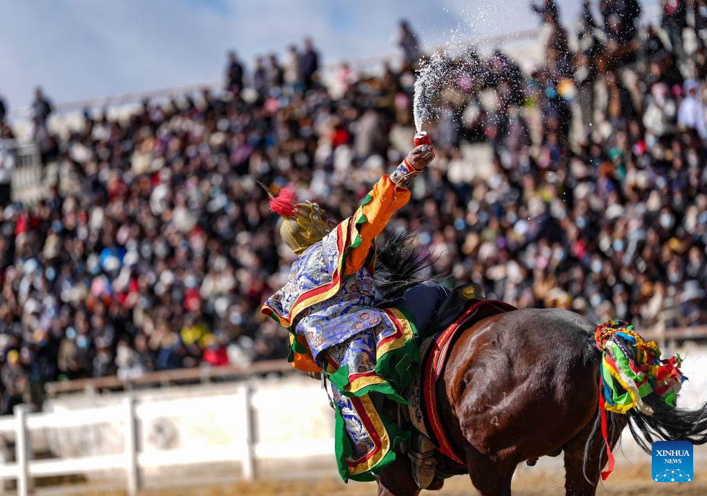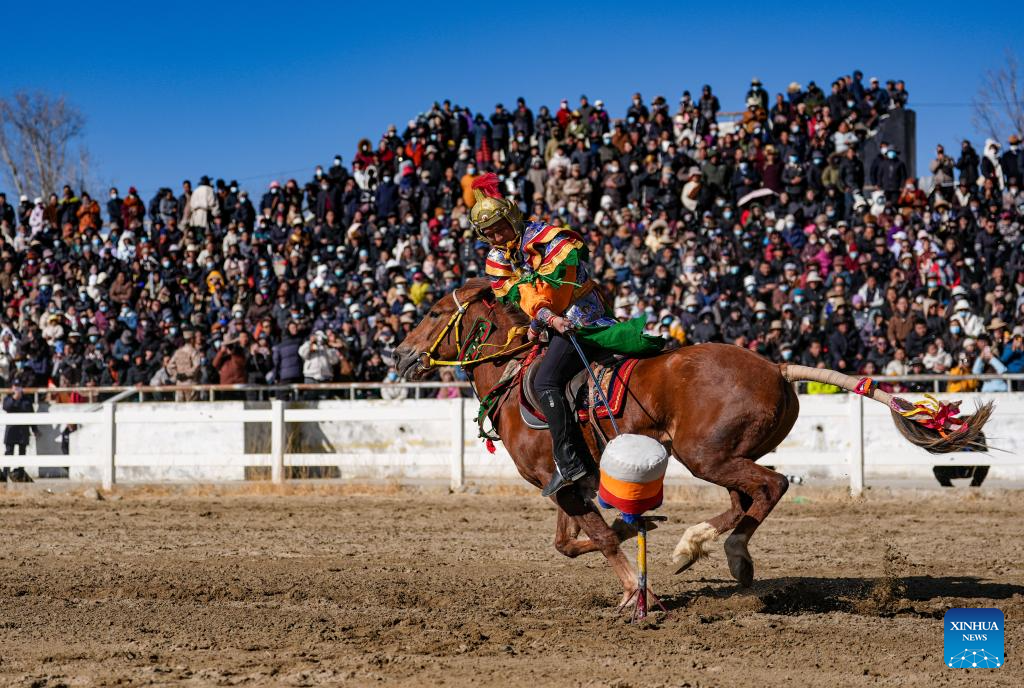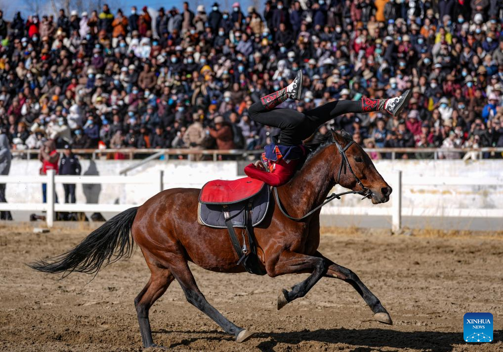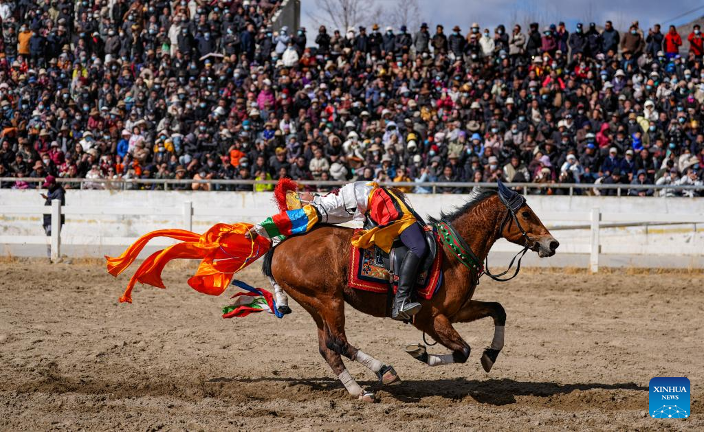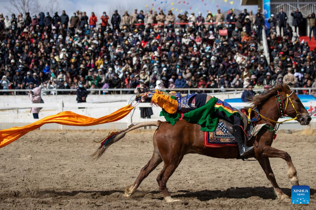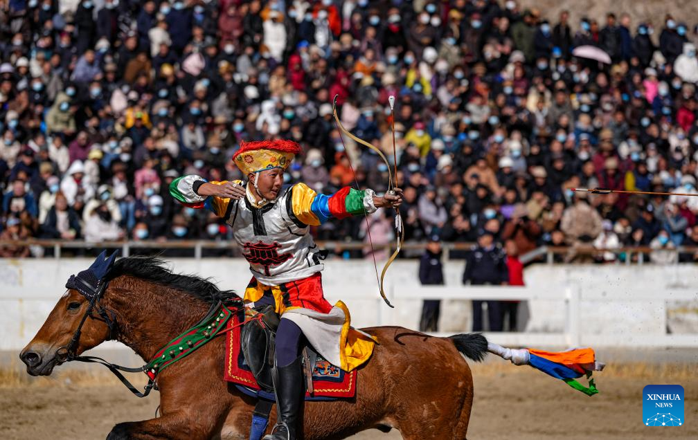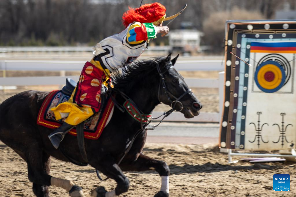 A rider performs riding and archery in Lhasa, southwest China's Xizang Autonomous Region, March 2, 2025. The city of Lhasa hosted an equestrian show on the third day of the Tibetan New Year, featuring traditional equestrian performances and horse races. The riders were dressed in colorful Tibetan clothes and galloped gracefully around the racecourse in the northern suburbs of the city. (Xinhua/Jiang Fan)