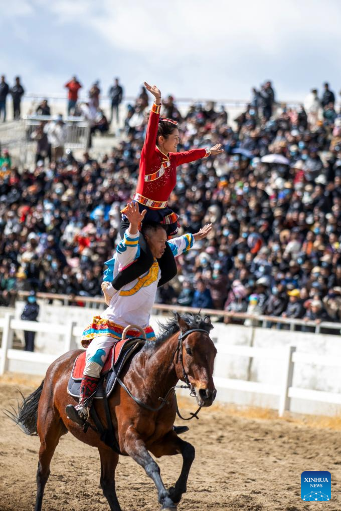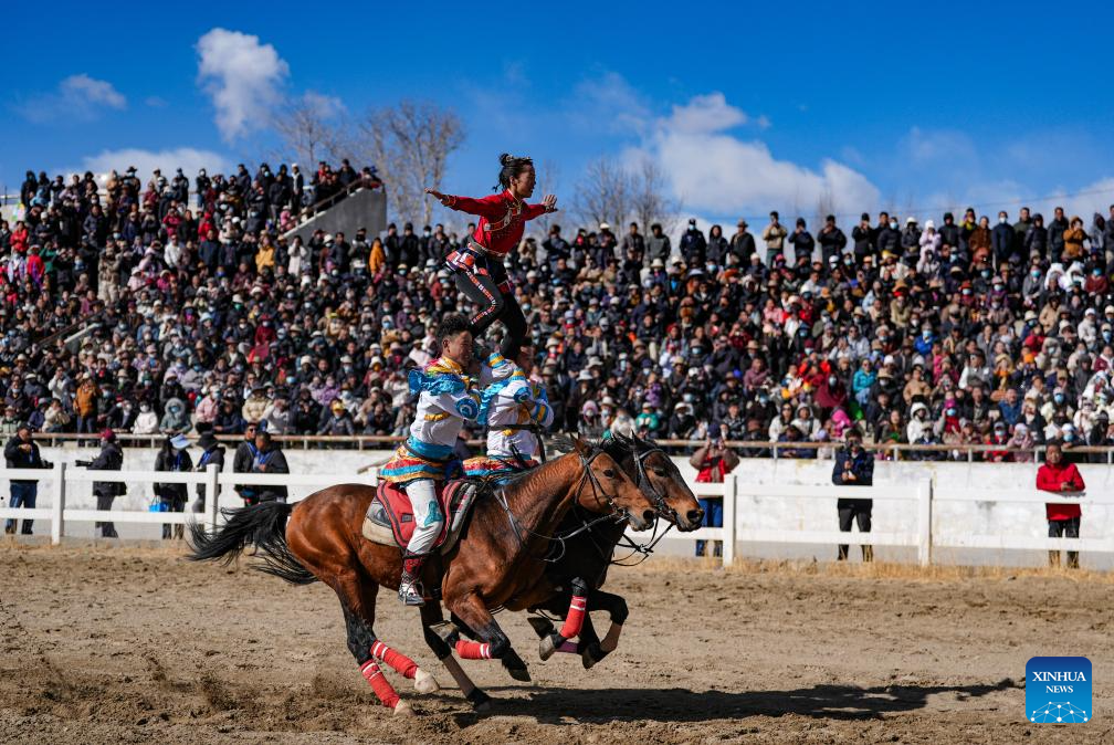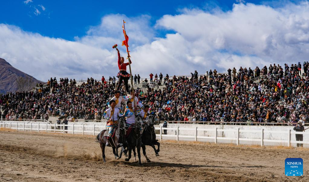 Riders perform in Lhasa, southwest China's Xizang Autonomous Region, March 2, 2025. The city of Lhasa hosted an equestrian show on the third day of the Tibetan New Year, featuring traditional equestrian performances and horse races. The riders were dressed in colorful Tibetan clothes and galloped gracefully around the racecourse in the northern suburbs of the city. (Xinhua/Jiang Fan)