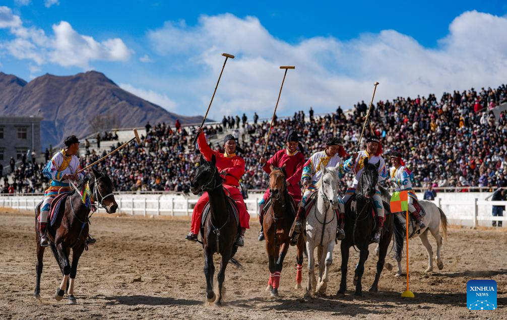 Riders stage a polo match in Lhasa, southwest China's Xizang Autonomous Region, March 2, 2025. The city of Lhasa hosted an equestrian show on the third day of the Tibetan New Year, featuring traditional equestrian performances and horse races. The riders were dressed in colorful Tibetan clothes and galloped gracefully around the racecourse in the northern suburbs of the city. (Xinhua/Jigme Dorje)
