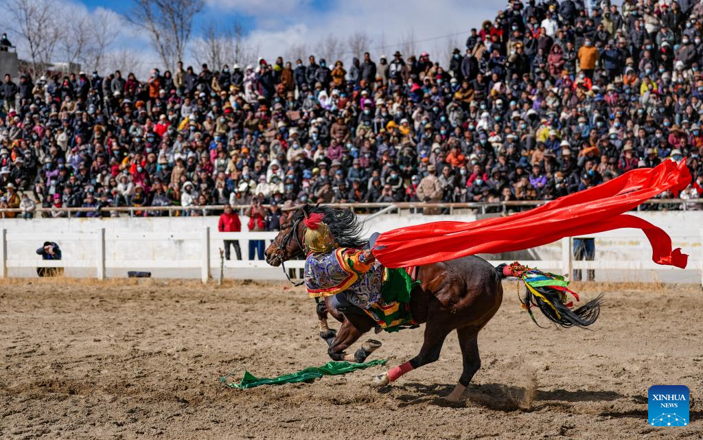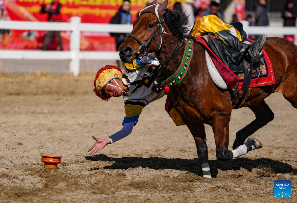 A rider performs hada (a traditional Tibetan silk scarf that symbolizes purity and auspiciousness) collecting in Lhasa, southwest China's Xizang Autonomous Region, March 2, 2025. The city of Lhasa hosted an equestrian show on the third day of the Tibetan New Year, featuring traditional equestrian performances and horse races. The riders were dressed in colorful Tibetan clothes and galloped gracefully around the racecourse in the northern suburbs of the city. (Xinhua/Jiang Fan)