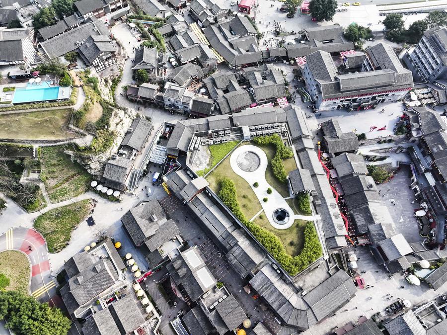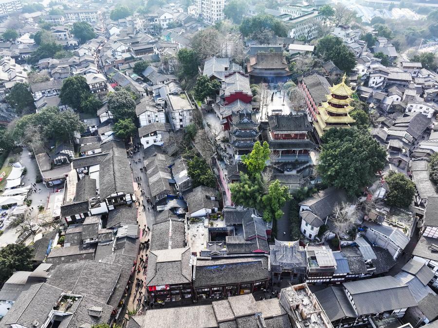 An aerial drone photo taken on Feb. 28, 2025 shows a view of the Ciqikou ancient town in southwest China's Chongqing Municipality. (Xinhua/Wang Quanchao)