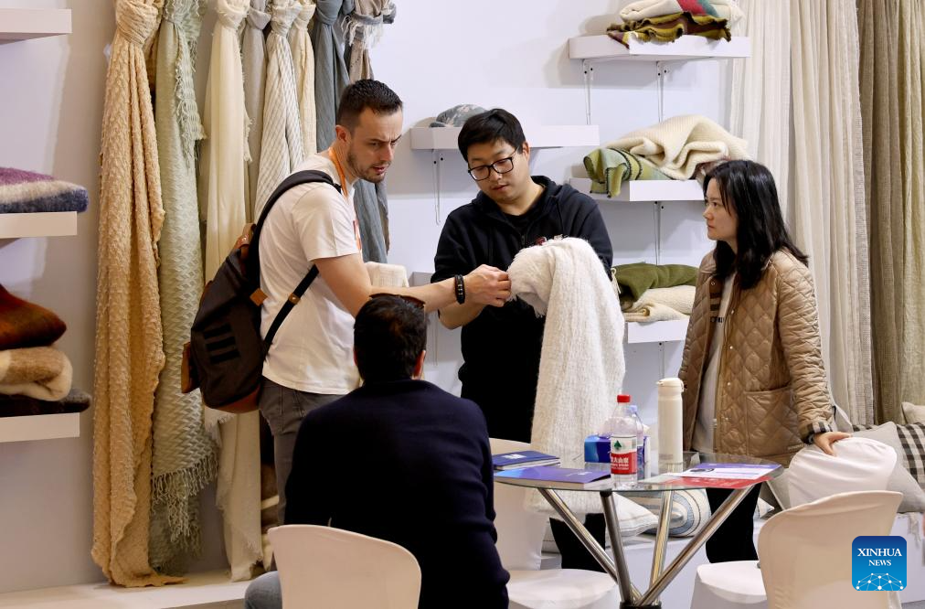 An overseas purchaser (1st L) learns about textile products at a booth during the 33rd East China Fair in Shanghai, east China, March 1, 2025. The 33rd East China Fair kicked off here on Saturday, featuring more than 5,100 booths in six themed sections of garments, textiles, household products, gifts, cross-border e-commerce, and overseas business. (Xinhua/Fang Zhe)