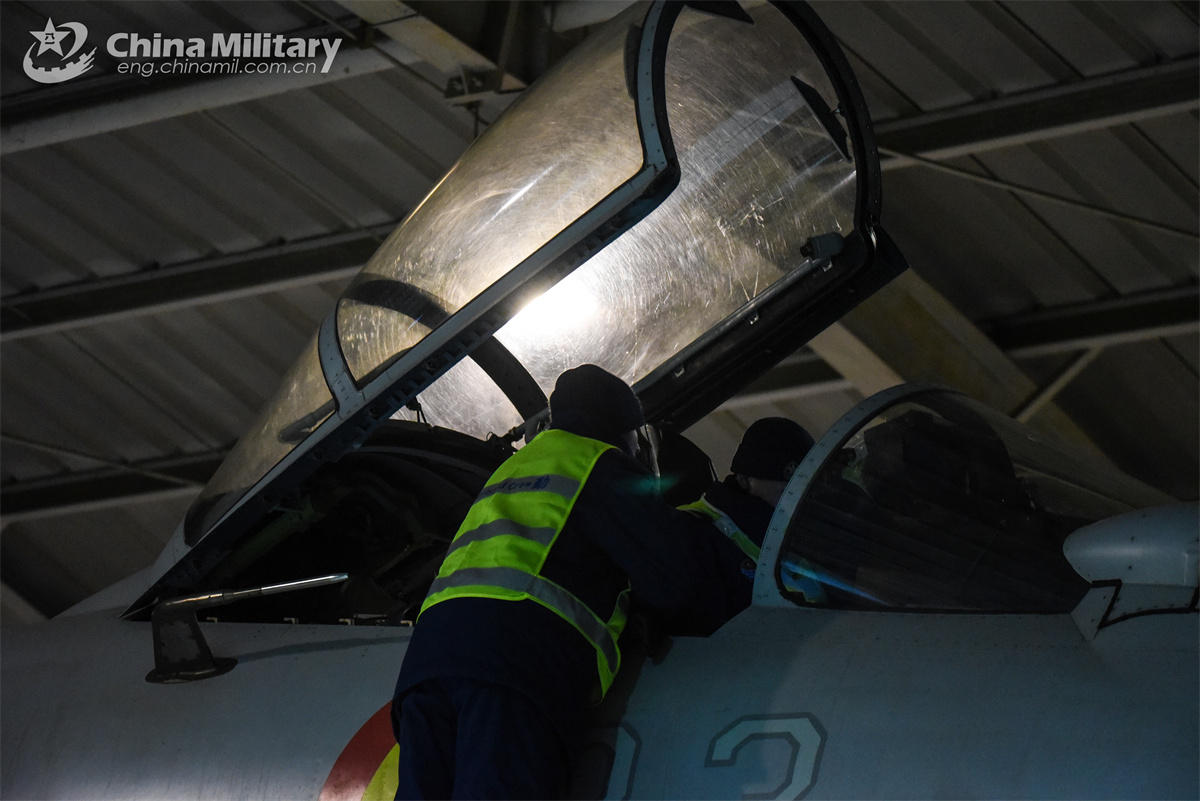 A maintenance man assigned to a regiment under the Chinese PLA Naval Aviation University conducts pre-flight inspection with a J-15 fighter pilot during an eight-hour day-and-night flight training exercise in northeast China's Liaoning Province on February 20, 2025. (eng.chinamil.com.cn/Photo by Xu Yinglong)
