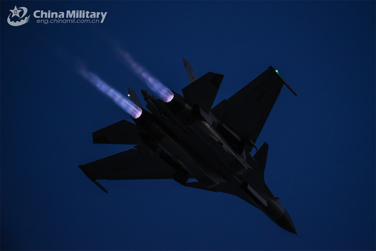 A J-15 carrier-based fighter jet attached to a regiment under the Chinese PLA Naval Aviation University soars into the sky during an eight-hour day-and-night flight training exercise in northeast China's Liaoning Province on February 20, 2025. (eng.chinamil.com.cn/Photo by Xu Yinglong)