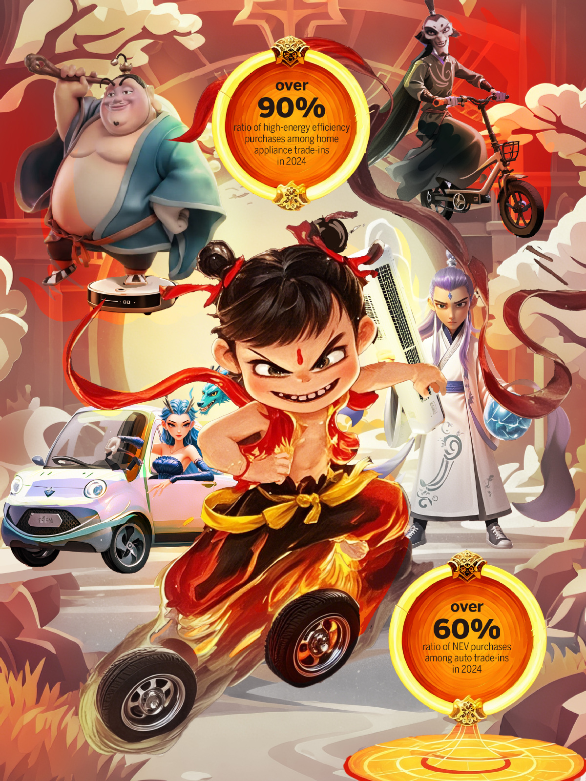 Among automobile trade-ins, more than 60 percent of the purchases were new energy vehicles, with over 6.6 million old vehicles replaced by new energy or energy-efficient cars. For home appliance trade-ins, sales of products with high energy efficiency accounted for over 90 percent, driving retail sales of highly energy-efficient home appliances and smart home appliances to double-digit growth for four consecutive months.