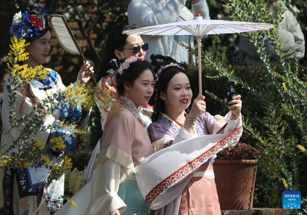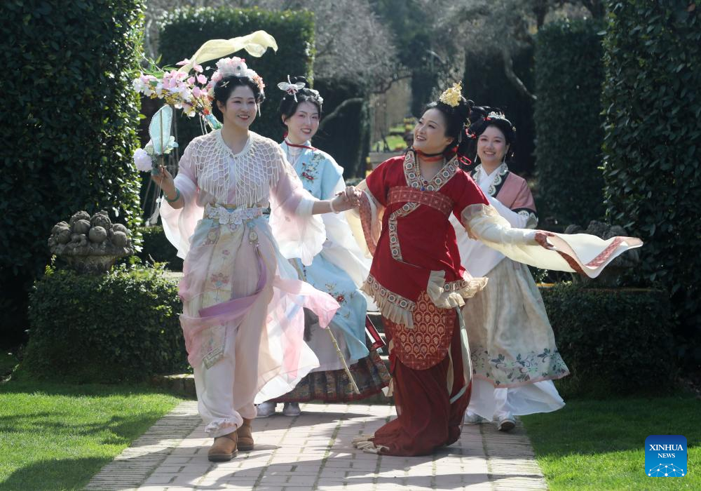 Hanfu enthusiasts attend a celebration of the Huazhao Festival, or the flower goddess' birthday, at the Filoli Historic House & Garden in Woodside, California, the United States, March 1, 2025. (Photo by Liu Yilin/Xinhua)