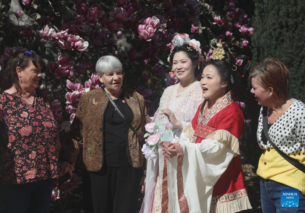 Hanfu enthusiasts interact with tourists during a celebration of the Huazhao Festival, or the flower goddess' birthday, at the Filoli Historic House & Garden in Woodside, California, the United States, March 1, 2025. (Photo by Liu Yilin/Xinhua)