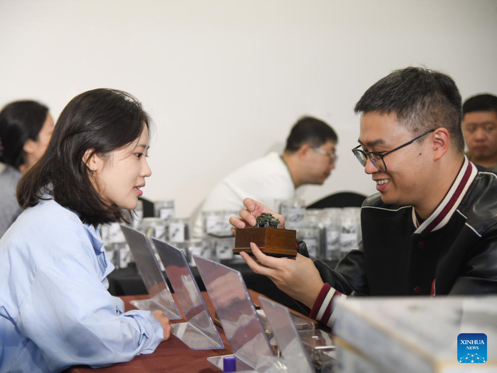 Zeng Zhou (R) communicates with a participant during a contest of creative ideas on static models in Chengdu, southwest China's Sichuan Province, Oct. 26, 2024. Zeng Zhou, a cultural creative product designer and planning operator born in the 1990s, has been fascinated with animation and movie peripheral products as well as trendy toys and figurines since his childhood, dreaming of developing cultural creative products that embody the charm of traditional Chinese culture.