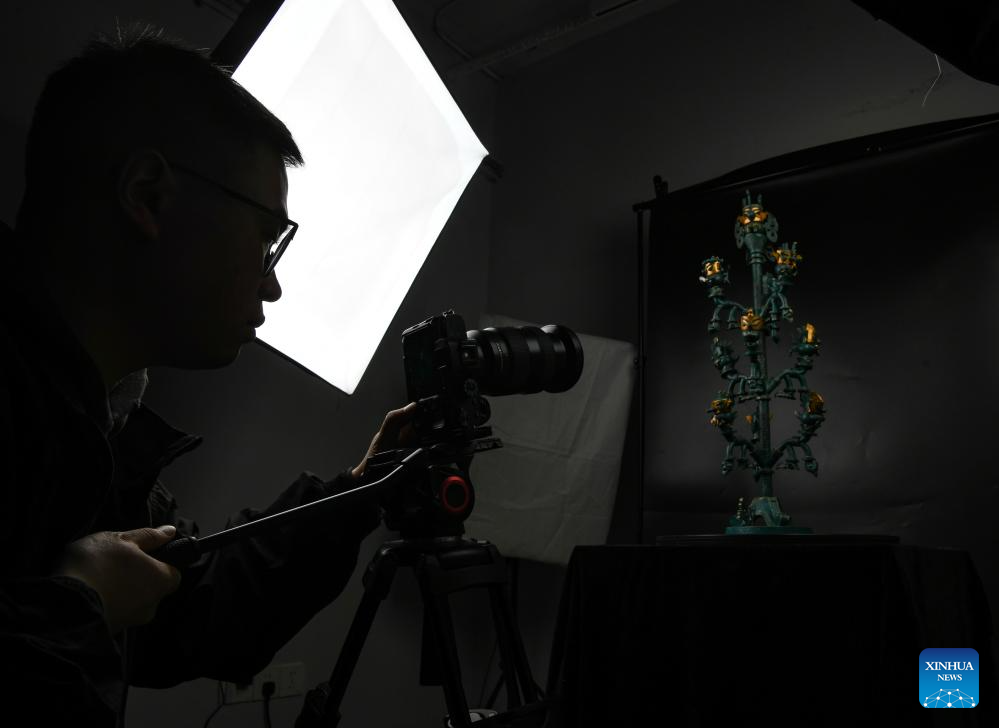 Zeng Zhou films a cultural creative product inspired by the Sacred Tree in the Sanxingdui Museum at his shop in Chengdu, southwest China's Sichuan Province, March 1, 2025. Zeng Zhou, a cultural creative product designer and planning operator born in the 1990s, has been fascinated with animation and movie peripheral products as well as trendy toys and figurines since his childhood, dreaming of developing cultural creative products that embody the charm of traditional Chinese culture.