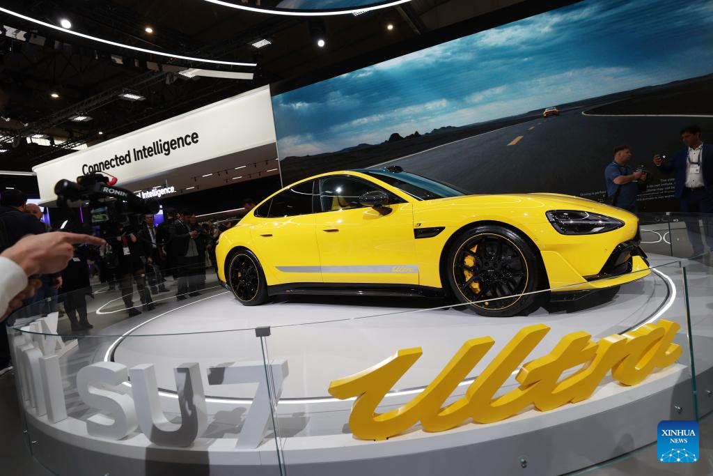People look at a Xiaomi SU7 Ultra during the 2025 Mobile World Congress in Barcelona, Spain, on March 3, 2025. The 2025 Mobile World Congress (MWC) opened here on Monday, bringing together industry leaders, policymakers, and technology innovators to explore advancements in 5G, artificial intelligence (AI), and advanced connectivity. (Xinhua/Zhao Dingzhe)
