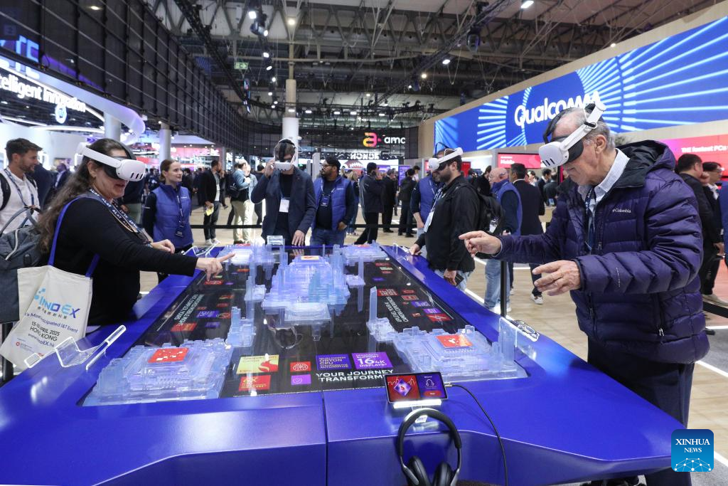 People try on VR headsets during the 2025 Mobile World Congress in Barcelona, Spain, on March 3, 2025. The 2025 Mobile World Congress (MWC) opened here on Monday, bringing together industry leaders, policymakers, and technology innovators to explore advancements in 5G, artificial intelligence (AI), and advanced connectivity. (Xinhua/Zhao Dingzhe)