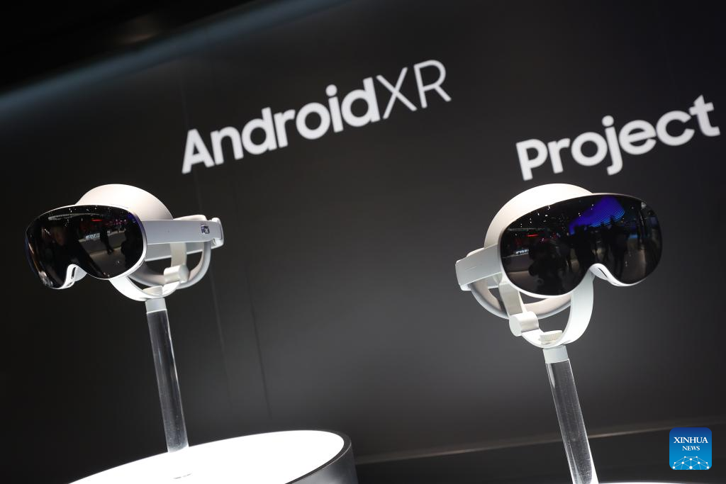 Samsung's Project Moohan headsets are on display during the 2025 Mobile World Congress in Barcelona, Spain, on March 3, 2025. The 2025 Mobile World Congress (MWC) opened here on Monday, bringing together industry leaders, policymakers, and technology innovators to explore advancements in 5G, artificial intelligence (AI), and advanced connectivity. (Xinhua/Zhao Dingzhe)