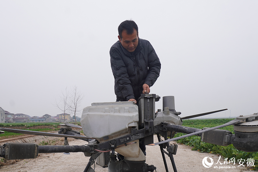 Cheng Xueze debugs a drone on a field in Zhanghu township, Wangjiang county, east China's Anhui Province. (People's Daily Online/Chen Ruotian)