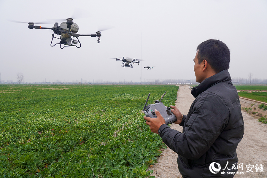 Cheng Xueze operates drones to fertilize rapeseed fields in Zhanghu township, Wangjiang county, east China's Anhui Province. (People's Daily Online/Chen Ruotian)