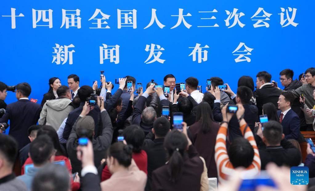 Lou Qinjian, spokesperson for the third session of the 14th National People's Congress (NPC), talks with journalists after a press conference at the Great Hall of the People in Beijing, capital of China, March 4, 2025. The NPC, China's national legislature, held a press conference on Tuesday, one day ahead of the opening of its annual session. (Xinhua/Zheng Huansong)