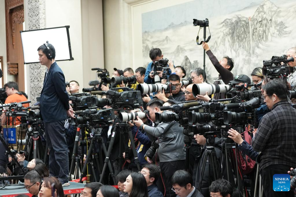 Journalists raise hands to ask questions at a press conference of the third session of the 14th National People's Congress (NPC) at the Great Hall of the People in Beijing, capital of China, March 4, 2025. The NPC, China's national legislature, held a press conference on Tuesday, one day ahead of the opening of its annual session. (Xinhua/Zheng Huansong)