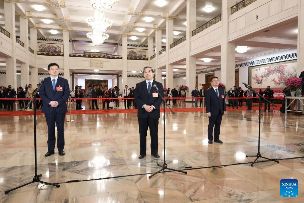 Members of the 14th National Committee of the Chinese People's Political Consultative Conference (CPPCC) attend a group interview ahead of the opening meeting of the third session of the 14th CPPCC National Committee at the Great Hall of the People in Beijing, capital of China, March 4, 2025. (Xinhua/Zhang Yuwei)