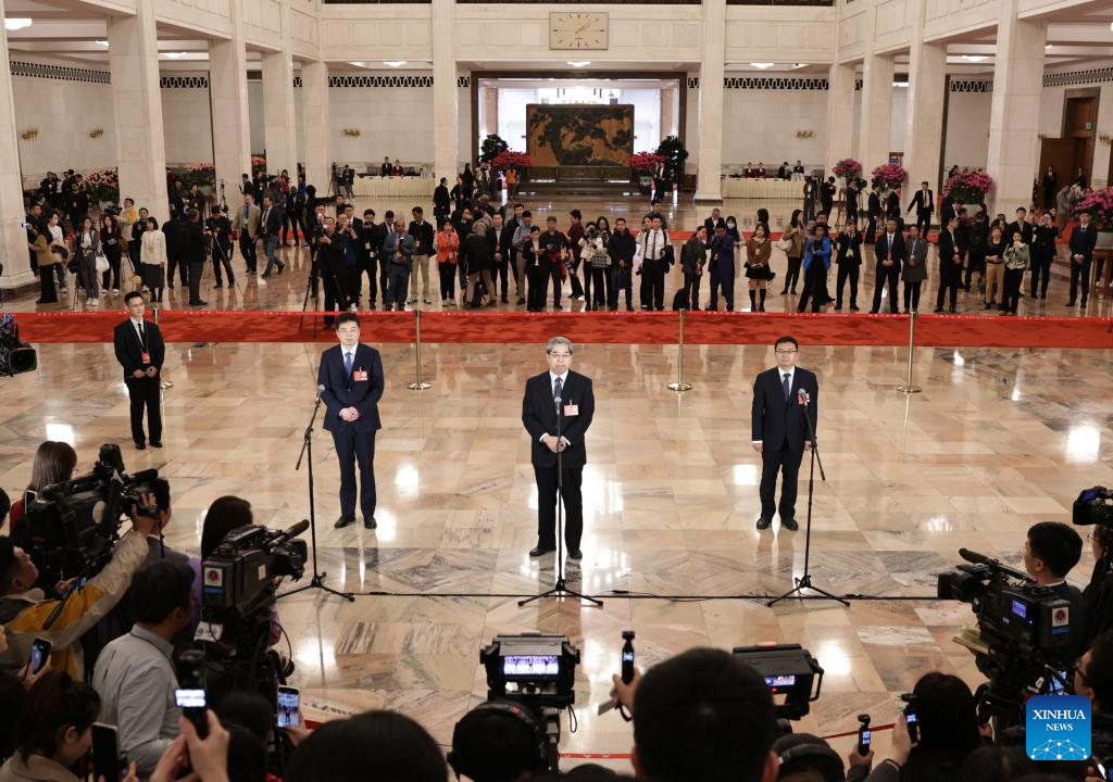 Members of the 14th National Committee of the Chinese People's Political Consultative Conference (CPPCC) attend a group interview ahead of the opening meeting of the third session of the 14th CPPCC National Committee at the Great Hall of the People in Beijing, capital of China, March 4, 2025. (Xinhua/Yin Gang)