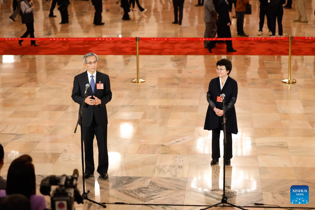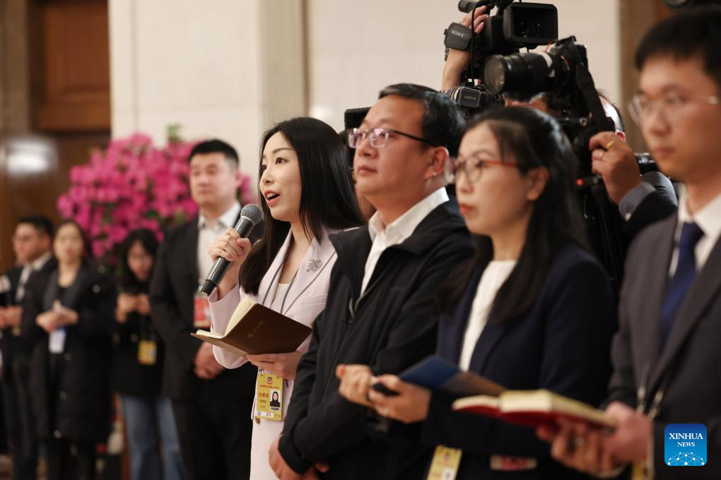 Members of the 14th National Committee of the Chinese People's Political Consultative Conference (CPPCC) attend a group interview ahead of the opening meeting of the third session of the 14th CPPCC National Committee at the Great Hall of the People in Beijing, capital of China, March 4, 2025. (Xinhua/Zhang Yuwei)