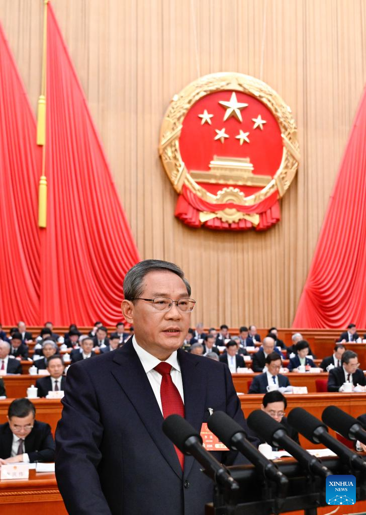 Chinese Premier Li Qiang delivers a government work report at the opening meeting of the third session of the 14th National People's Congress (NPC) at the Great Hall of the People in Beijing, capital of China, March 5, 2025. (Xinhua/Li Xueren)
