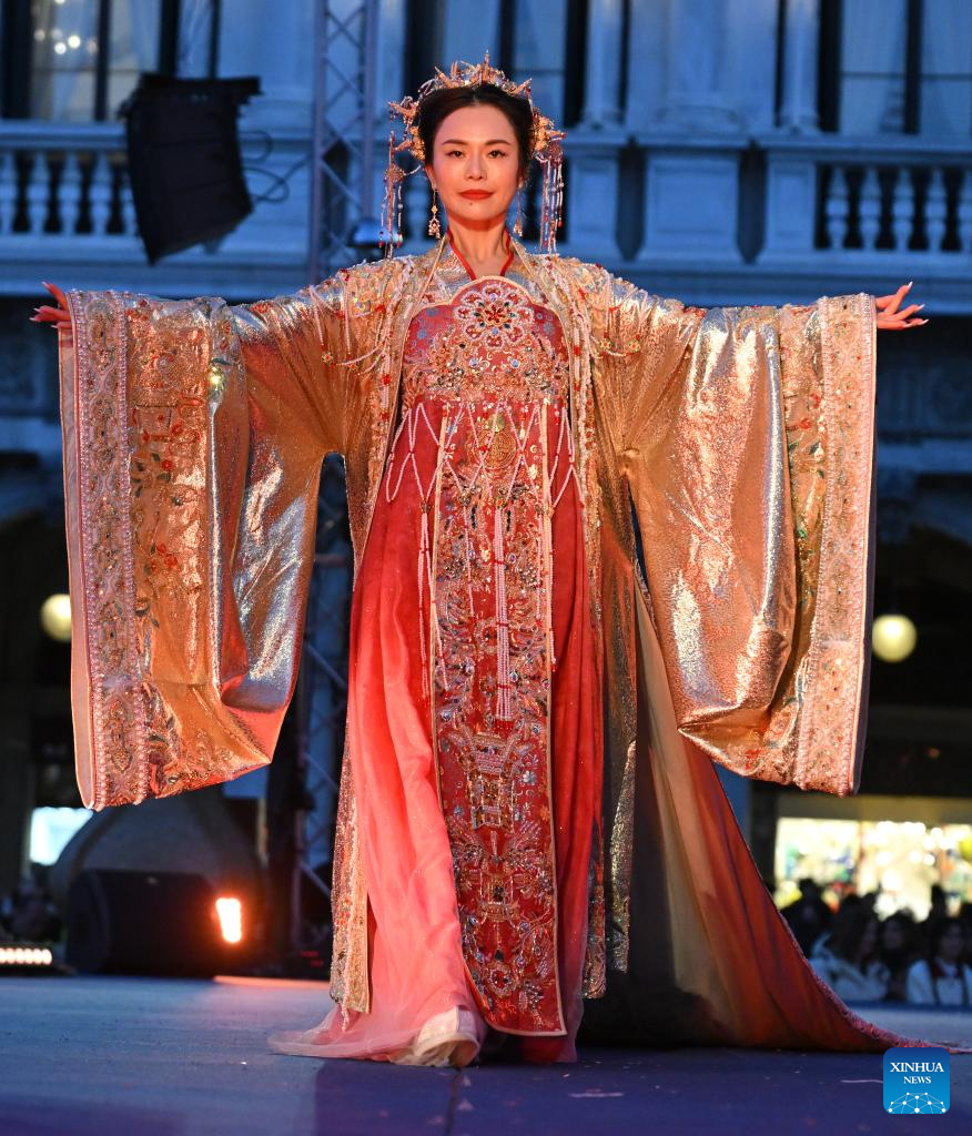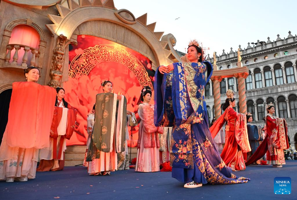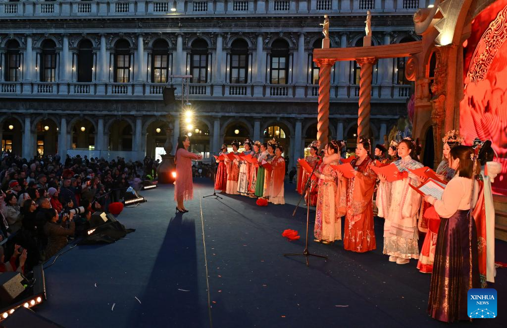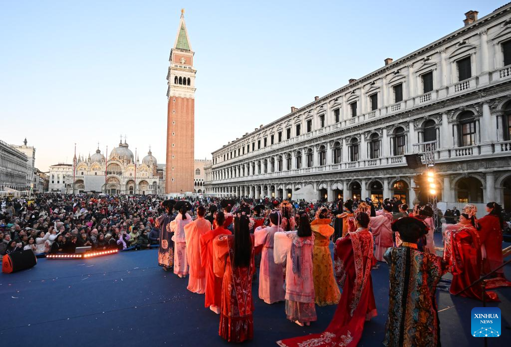 Performers in traditional Chinese attire are pictured during the Venice Carnival at San Marco Square in Venice, Italy, March 4, 2025. (Photo by Alberto Lingria/Xinhua)