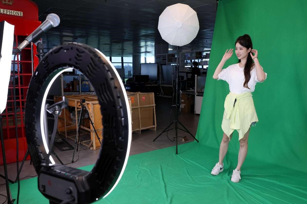 A woman has her AI counterpart generated in Digital Education Town in Fuzhou, southeast China's Fujian province. (People's Daily Online/Wang Wangwang)