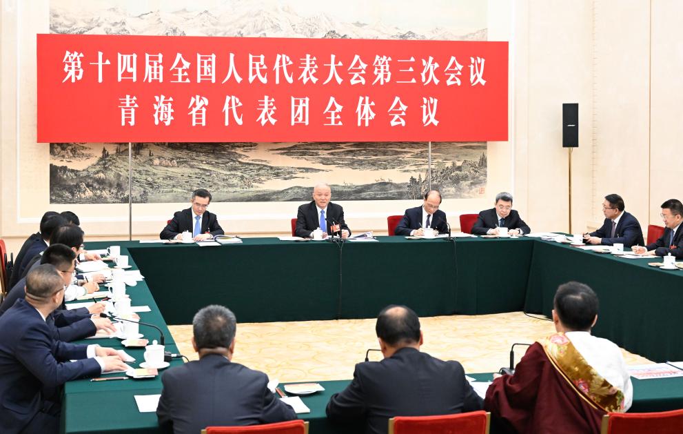Cai Qi, a member of the Standing Committee of the Political Bureau of the Communist Party of China (CPC) Central Committee and a member of the Secretariat of the CPC Central Committee, participates in a group deliberation with his fellow deputies from Qinghai Province at the third session of the 14th National People's Congress (NPC) in Beijing, capital of China, March 7, 2025. (Xinhua/Shen Hong)