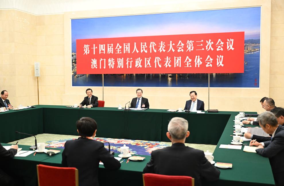 Vice Premier Ding Xuexiang attended group deliberations with deputies from Hong Kong and Macao special administrative regions, respectively. He noted that China has made solid progress in its modernization and achieved new breakthroughs in advancing the cause of "one country, two systems."