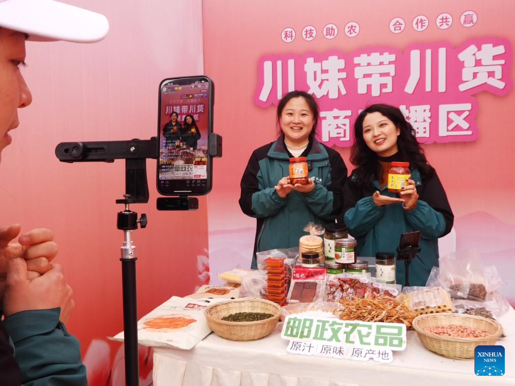 Women promote agricultural products via livestream during an event celebrating the International Women's Day in Dazhou City, southwest China's Sichuan Province, March 7, 2025. Various activities are held across the country to mark the International Women's Day. (Photo by Deng Liangkui/Xinhua)