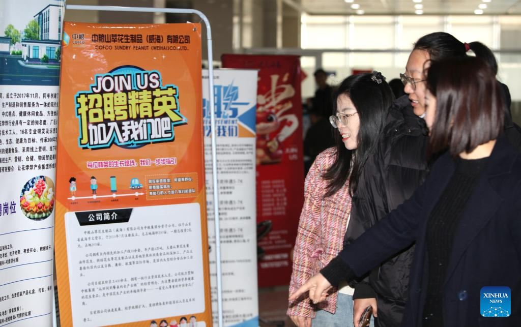 Women look for job opportunities during a job fair held for women in Weihai, east China's Shandong Province, on March 7, 2025. Various activities are held across the country to mark the International Women's Day. (Photo by Chen Hongqing/Xinhua)