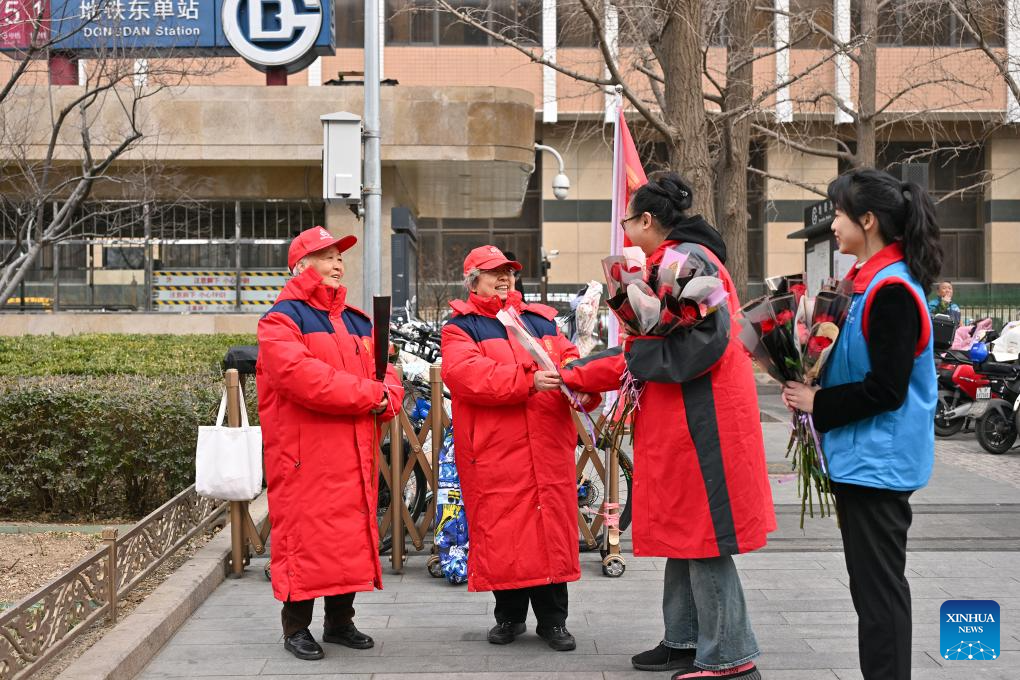 Community workers present flowers to volunteers (1st &2nd L) near a subway station in Dongcheng District in Beijing, capital of China, March 7, 2025. Various activities are held across the country to mark the International Women's Day. (Xinhua/Li Xin)