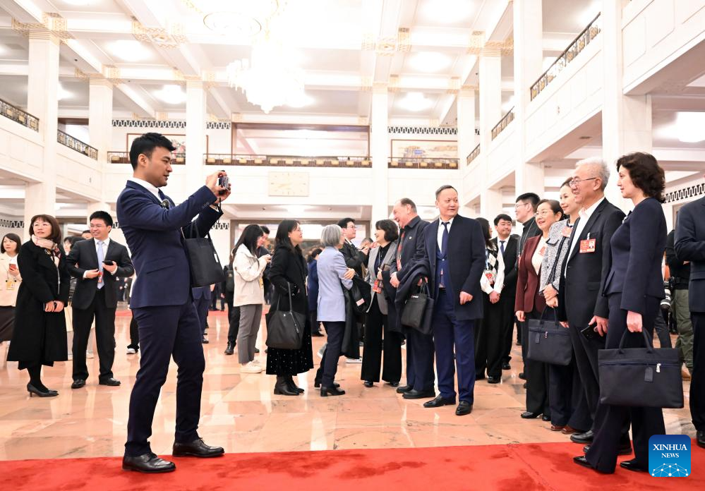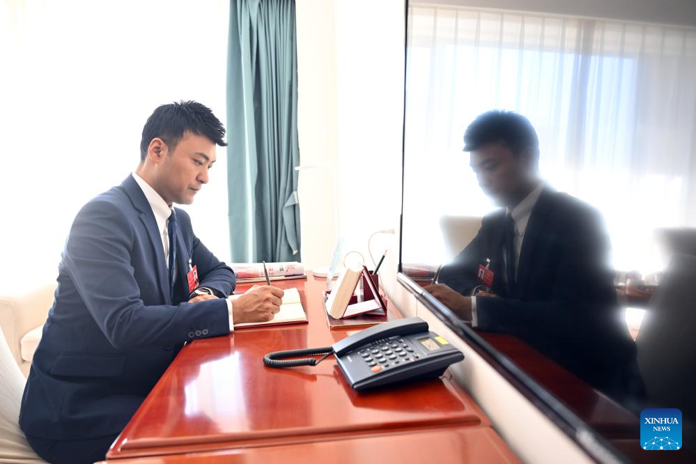 Henizat Tohti takes a short video at the Great Hall of the People in Beijing, capital of China, March 7, 2025.