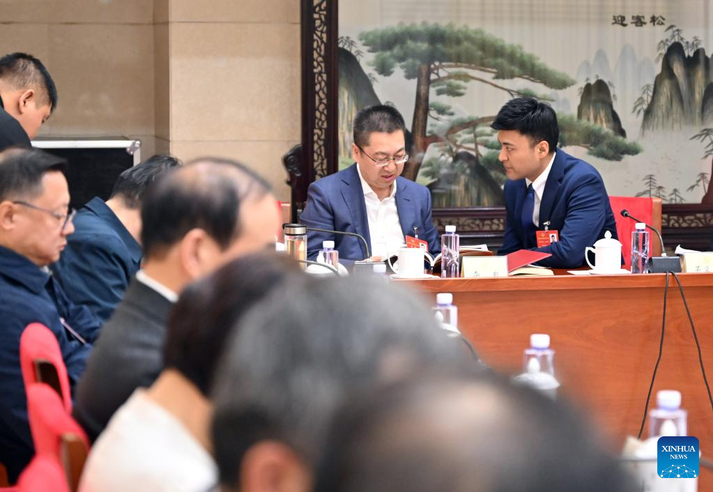Henizat Tohti (1st R) talks with other political advisors in Beijing, capital of China, March 6, 2025.